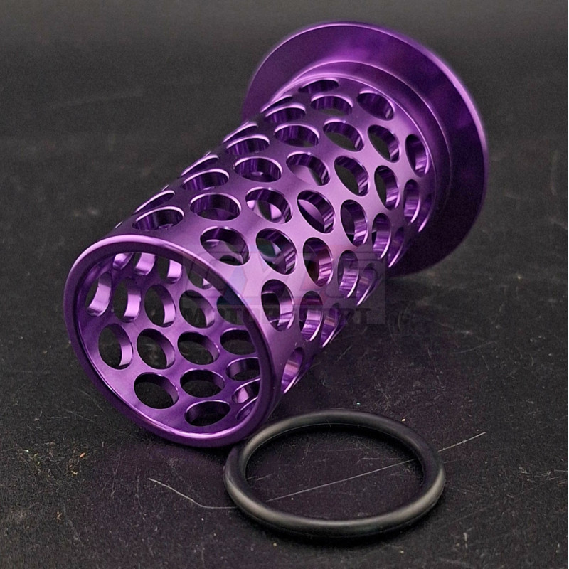 Cage interne de maintien pour filtre à huile BMW, usinée CNC en aluminium 6061-T6 anodisé. Empêche l’écrasement du filtre, stabilise débit et pression. Compatible uniquement avec notre couvercle de filtre à huile performance.