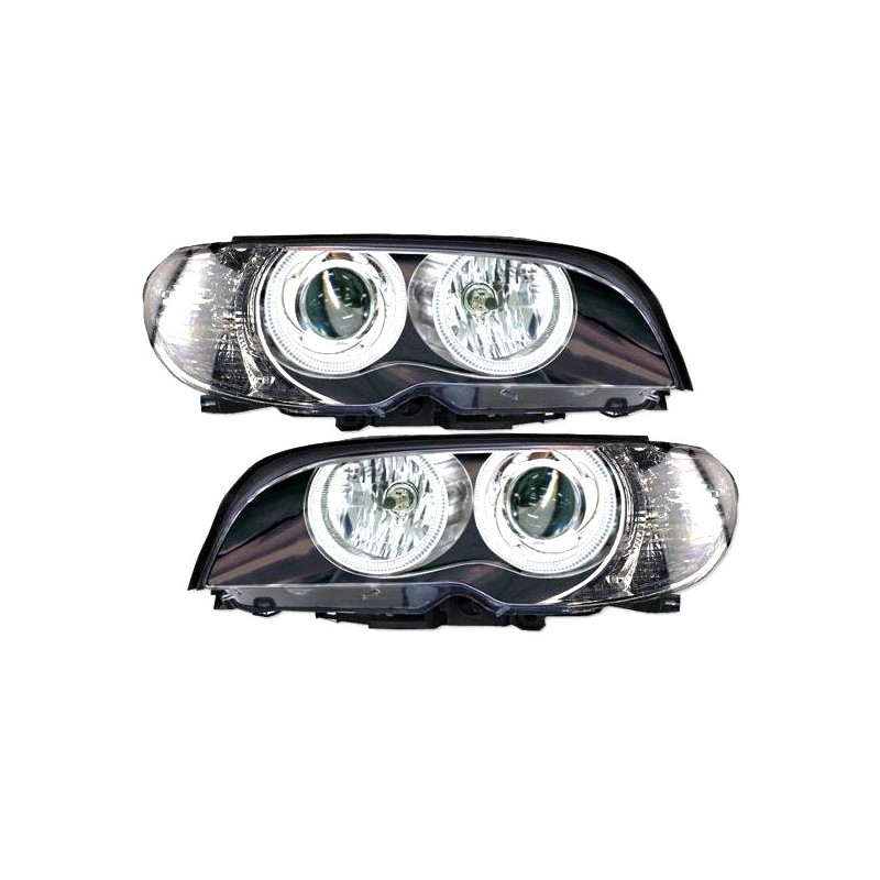 Paire de phares design Angel Eyes noirs pour BMW Série 3 E46 Coupé et Cabriolet phase 2 (2003–2007). Finition noire, moteur de réglage intégré, montage plug & play H7/H7.
