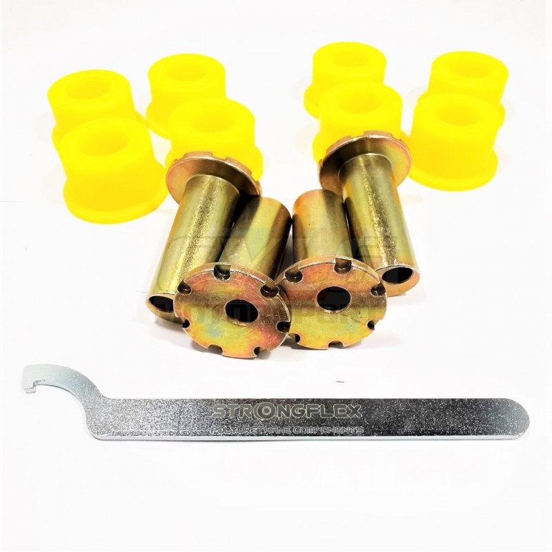Kit silent-blocs réglables Strongflex pour bras arrière BMW E28, E34, E24 et E32 (versions Ø44mm). Déport 5 mm pour correction de carrossage. Idéal véhicules abaissés ou usage piste. Polyuréthane haute performance.